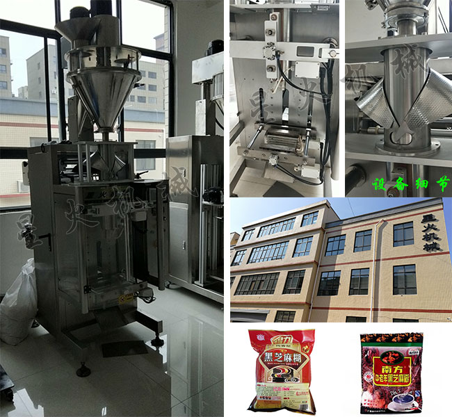 星火廠房展示全自動粉劑包裝機械設備、設備細節(jié)及芝麻糊包裝機包裝樣品