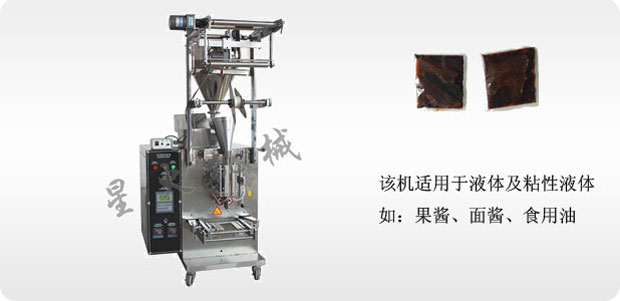 該自動醬體包裝機適用于有流動性的液體及粘性液體、如果醬、面醬、食用油、礦泉水、果汁、發(fā)乳等多種液體和膏體的定量灌裝及全自動包裝。